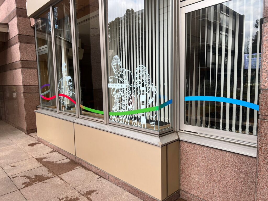 こちらのガラス面はフォトスポットにもなっており、室内にいる生徒さんとグラフィックが重なることで会話をしているような写真を撮ることができるデザインとなっています。